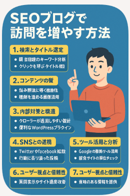 このように、SEOブログは単なる文章ではなく、検索エンジンとユーザーの両方に評価される構成と内容が求められます。あなたのブログがGoogle検索で上位表示されるよう、ぜひこのガイドを参考にしてください。